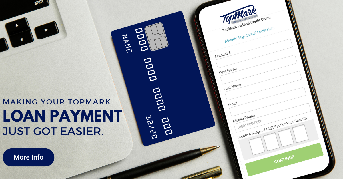 Use our secure online banking service to transfer your TopMark loan payment from your TopMark checking or savings account. You can also call a TopMark branch during business hours to have a member service representative make the loan payment transfer for you. You can even set this transfer to take place automatically every month.